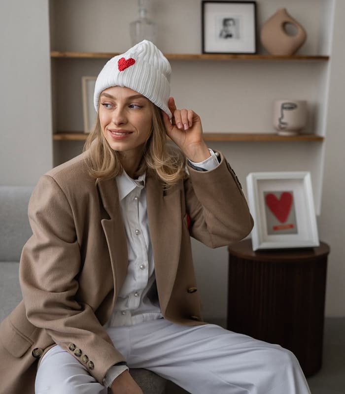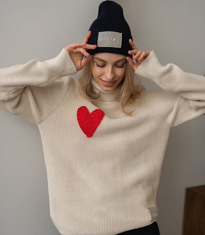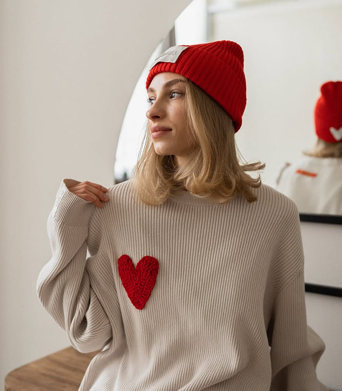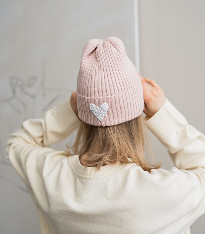 This laconic bini hat made of soft cotton is an essential accessory for looks with coats and down jackets. We wanted to make it as warm as possible, so we knitted it in four threads and provided a lapel, the height of which can be adjusted.